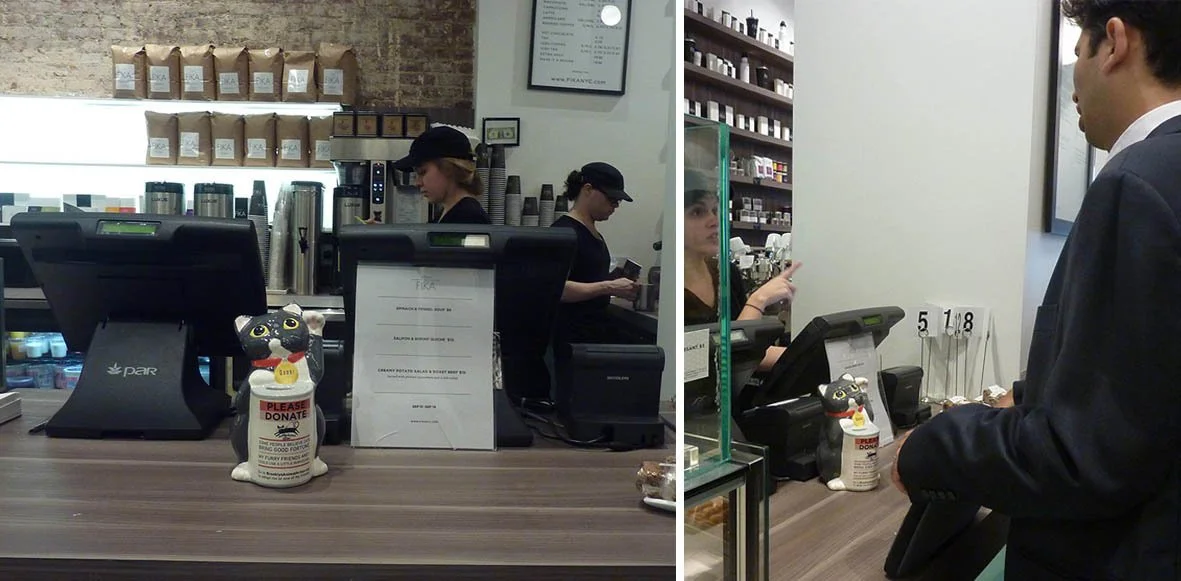 I had each lucky cat hand-glazed to resemble a cat in need of adoption and placed next to cash registers in over 40 locations in Brooklyn.